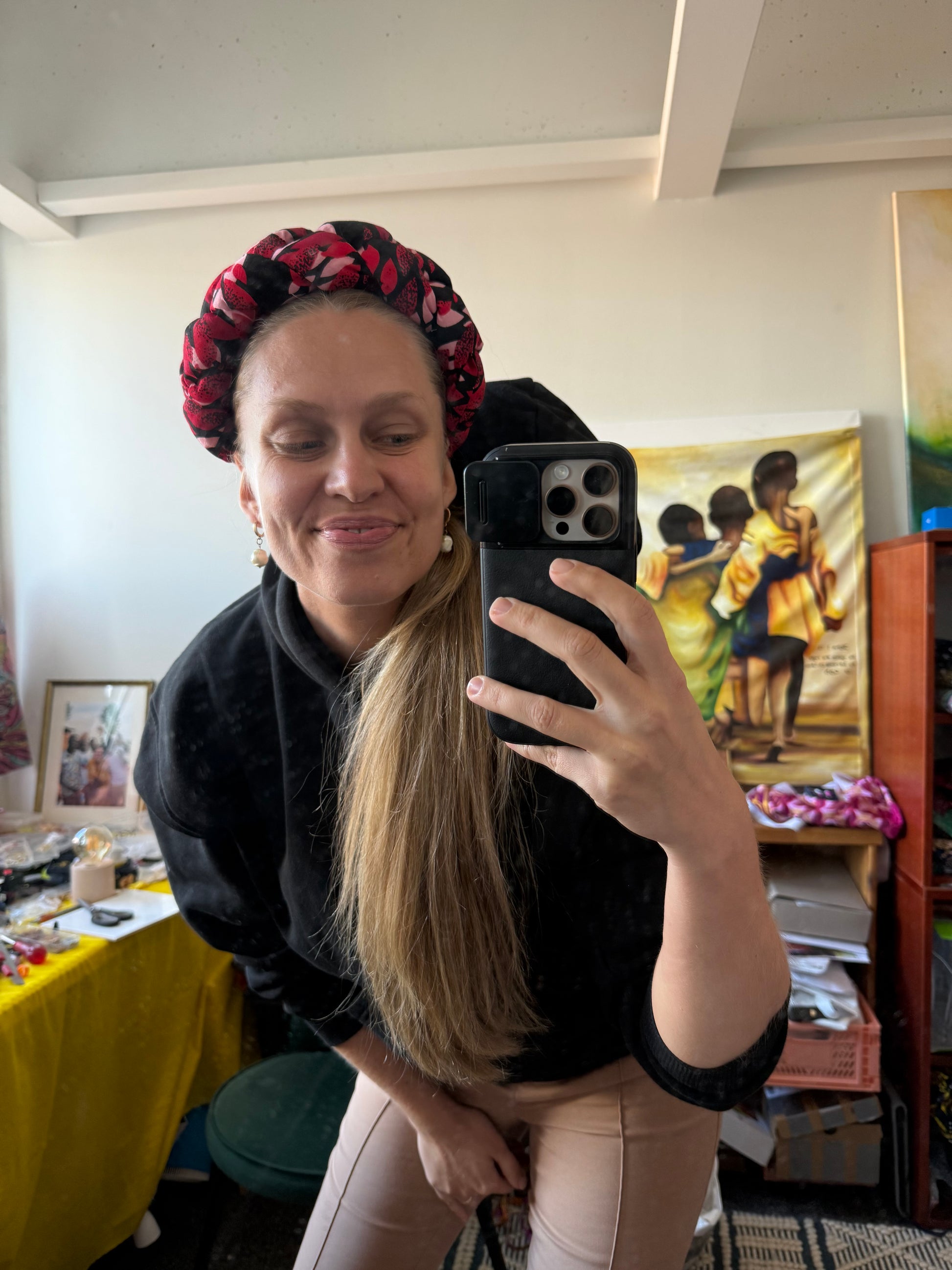 These unique headbands (colors Lucy and Jackie) are made of kitenge, an African cotton imported from Uganda. The fabric used for the headbands is leftover pieces from Shop's clothes. The white braided headband is made of satin.